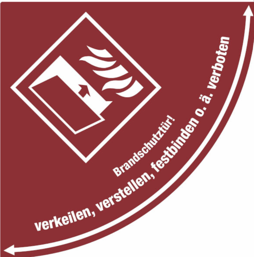 3: Oftmals sind Brand- und Rauchschutztüren "nur" mit einem Aufkleber gekennzeichnet. Um die Aufmerksamkeit im betrieblichen Alltag zu erhöhen, kann sich die Nutzung von Bodenaufklebern (siehe Bild) empfehlen. Ergänzt werden kann dies auch mit Aufklebern/Hinweisen in anderen Landessprachen.